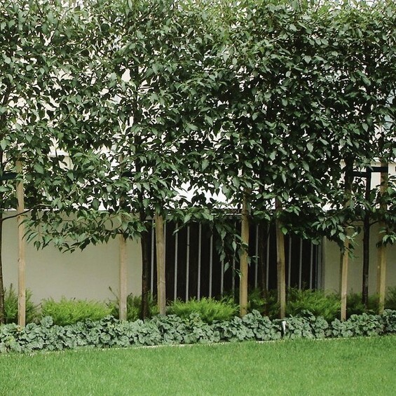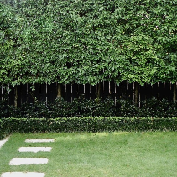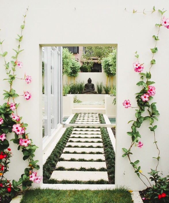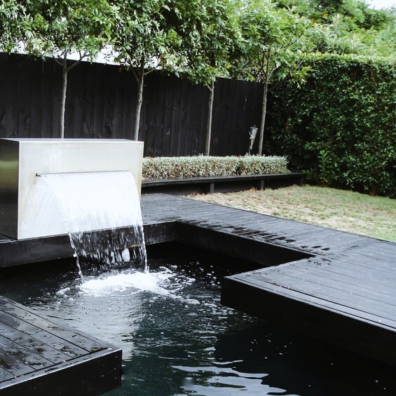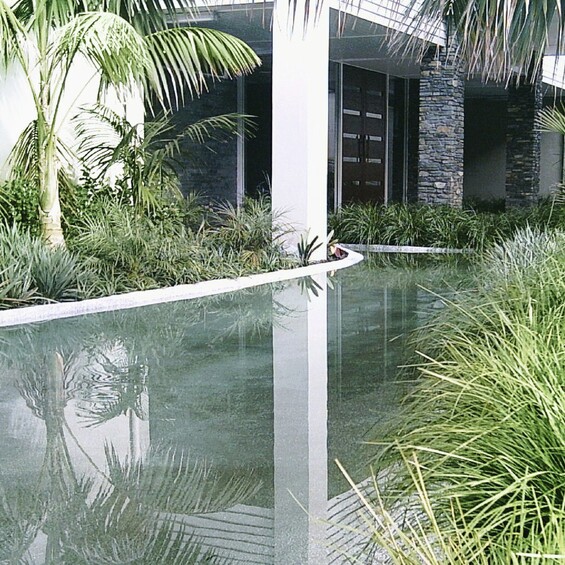 In transforming these gardens, elements such as new walling and column design were called for to accentuate the style of the architecture. Custom designed iron gates, travertine entrance stairs, and accent lighting, combined to create a welcoming sense of arrival.