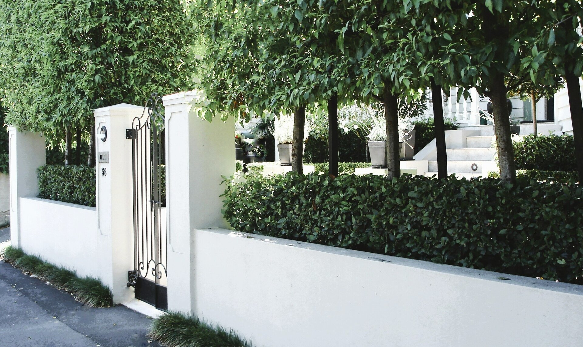 In transforming these gardens, elements such as new walling and column design were called for to accentuate the style of the architecture. Custom designed iron gates, travertine entrance stairs, and accent lighting, combined to create a welcoming sense of arrival.